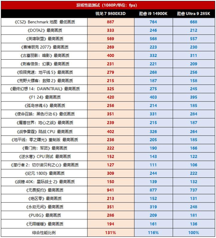 从游戏测试成绩来看,锐龙7 9800X3D面对竞品旗舰型号,游戏性能是酷睿Ultra 9 285K的131%,是酷睿i9-14900K的116%,可以说是跨代级领先。